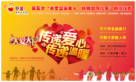 由华夏五千年环境科学研究院携手相关慈善机构发起的第五次“关爱空巢老人·扶助留守儿童”捐赠仪式于2017年04月24日在安徽黄山(徽州文化园•华商山庄)圆满举行!始终以“万千学者慈善行,共献大爱暖人间”为永久宗旨。